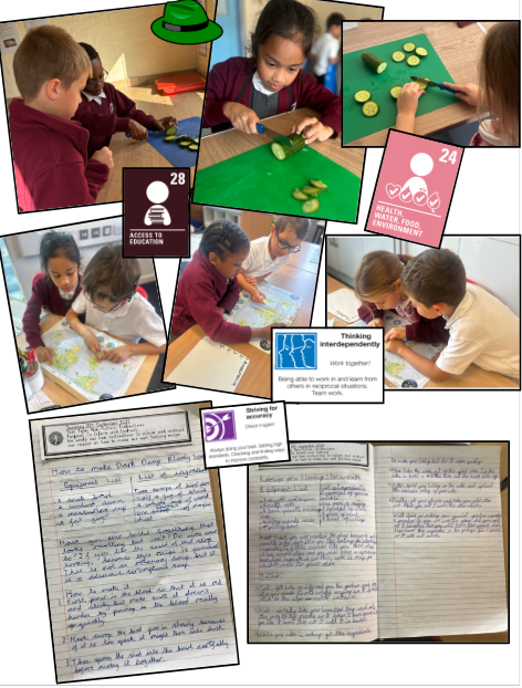 As designers, Year 3 continued with their DT learning about savoury tarts and learnt how to cut food safely using the claw cutting technique. We will be using this skill next week when we cook our savoury tarts! As geographers, we used atlases to learn how to identify places in the world using lines of longitude and latitude. We identified continents and oceans that lie on the different lines! As writers and using our green hat thinking, we have been designing our own fantasy food product in English. This week, we independently wrote our recipes using all the new writing skills we have been learning in Year 3, including subordinate conjunctions and adverbs.