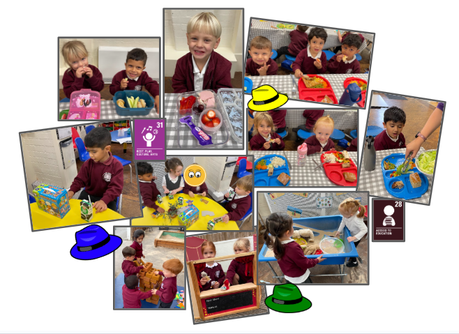 We ended our topic 'Happily Ever After' this week with the story of Little Red Riding Hood. Using notcing lenses, the children were able to identify different parts of the body and talk about the foods in Little Red's basket. They enjoyed using their cutting skills to select foods for their own baskets. On the theme of food, the children are showing lots of confidence at lunch time and when getting a snack in our cafe. Look at how much fun we have been having this week!