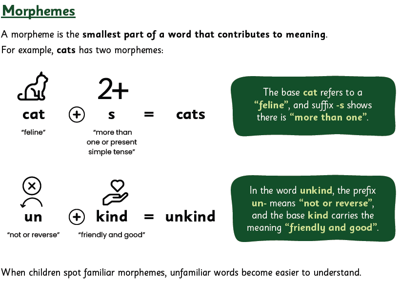 The teaching of spelling builds on the children’s phonological skills developed during the early stages of their literacy development. Building on this knowledge, from Year 2, children focus on the etymology and morphology in spelling, which means understanding where words come from and how words are made up of smaller parts called morphemes, such as: