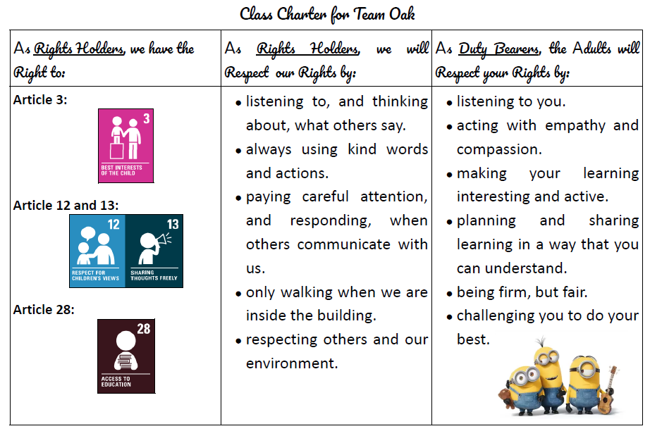 To ensure that children take risks and meet their potential, we create a safe and supportive learning environment. We do this by having the School Charter/Code of Behaviour (which has 3 rules linking to the UNCRC) as well as class charters for each team. The class charters are drawn up by each team at the beginning of the school year alongside the class teacher, and are regularly reviewed. See below for an example of a Year 1 (Team Oak) charter and a Year 6 charter (Team Maple). These charters are based on respect and other core values which help us develop into responsible citizens.