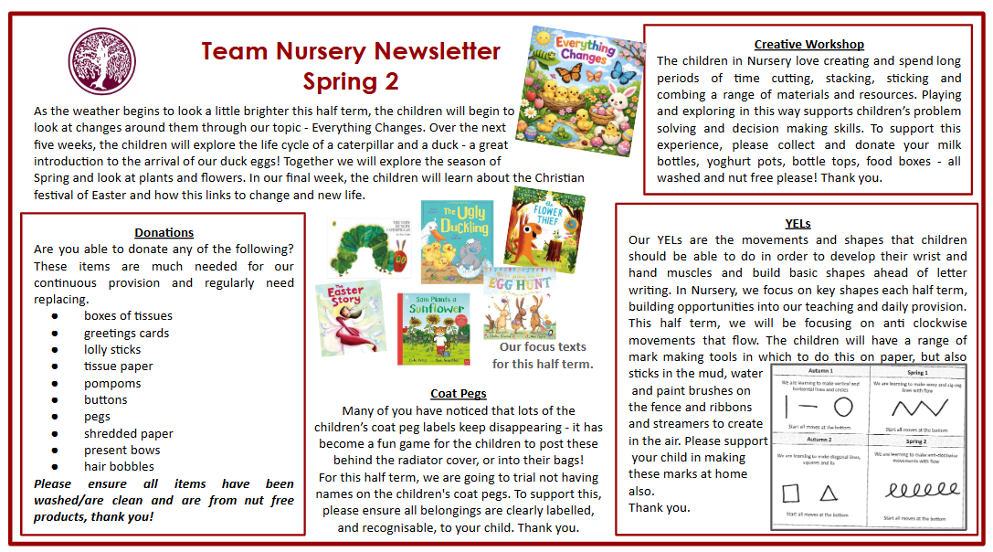 The children in Nursery are all involved in choosing the half-termly topics. We discuss our interests and share our views as a collective group and then use the British value of democracy to vote for the final theme. Staff then use the children's interests to plan and deliver exciting and targeted learning opportunities across the half-term. Each topic begins with an exciting launch and concludes with a finale.