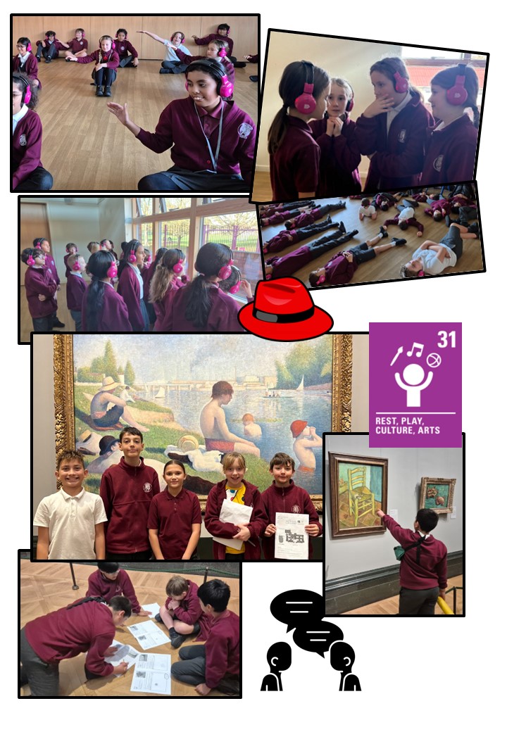 Listening with empathy, we trialled headphones which helped us immerse into a story which followed a main character into the Amazon rainforest. Using our red hats, we inferred how characters felt, physically reacting to the story. As artists, we visited the National Gallery and had the opportunity to take part in a colour workshop.
